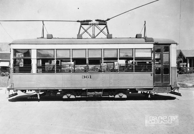 Ein Straßenbahntriebwagen vom Typ "Birney Safety Car". Da dieser Fahrzeugtyp an viele verschiedene Bahnen geliefert wurde, ist nicht klar, welcher Gesellschaft das abgebildete Fahrzeug gehörte. Möglicherweise ein Triebwagen der "Pacific Electric Railway Co", welche Triebwagen dieses Typs mit den Betriebsnummern 340-388 hatten.