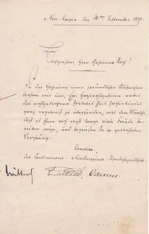 Somit ist klar, dass das Bild extra für den Geheimen Rat Gerhardt angefertigt worden war und dass die Maschine offensichtlich seinen Namen erhalten hatte. Welche Gründe für diese Namenswahl ausschlaggeben waren, ist leider nicht mehr bekannt, doch lässt der Begriff des „Patenkindes“ vermuten, dass er sich ganz besonders für die Beschaffung dieser Lok – vermutlich mit entsprechenden staatlichen Zuschüssen – eingesetzt hatte. Über den Geheimrat Gerhardt ist leider nur relativ wenig bekannt – aller Wahrscheinlichkeit nach handelte es sich um Carl August Friedrich Gerhardt-Bach. Er wurde 1832 in Potsdam geboren, wo sein Vater bis 1836 „Weg-Baumeister“ war. Dann aber zog dieser als Ober-Bauinspektor mit der Familie der im Bau fortschreitenden Ostbahn hinterher - von Frankfurt/Oder über Schönlanke, Bromberg, Dirschau, Elbing bis nach Gumbinnen. Auf den heranwachsenden Carl August könnte des Vaters Bahnbegeisterung abgefärbt haben, doch Carl studierte Jurisprudenz und Staatswissenschaften und arbeitete unter anderem in Gumbinnen, Königsberg und Bromberg an verschiedenen Gerichten, bevor er dann 1871 in Franfurt/Oder ansässig und Bürgermeister wurde. Später wurde er Erster Landessyndikus der Provinz Brandenburg und zog nach Berlin. In dieser Zeit war er wohl mit der Paulinenaue-Neuruppiner Eisenbahngesellschaft verbunden und wurde 1893 für seine Arbeit für die Provinz Brandenburg als Lokomotiv-Namensgeber geehrt. Anfang 1914 verstarb Carl Gerhardt in Berlin-Friedenau.