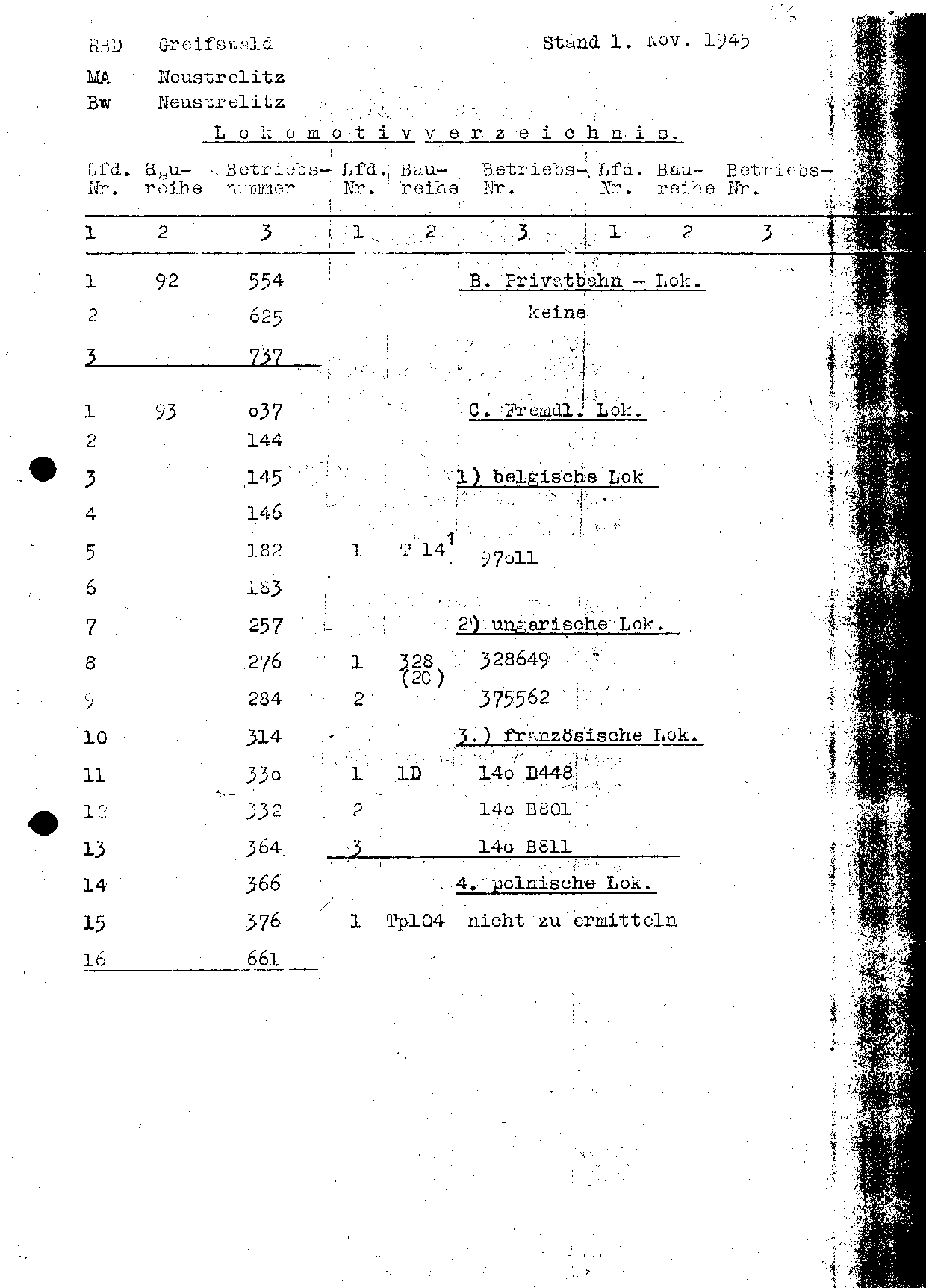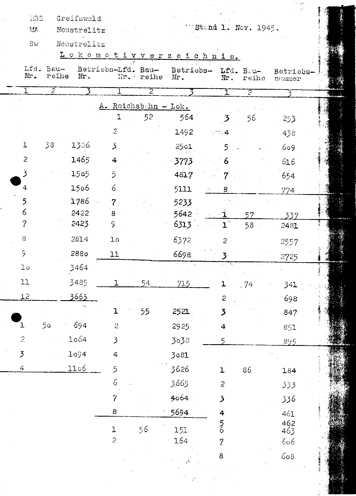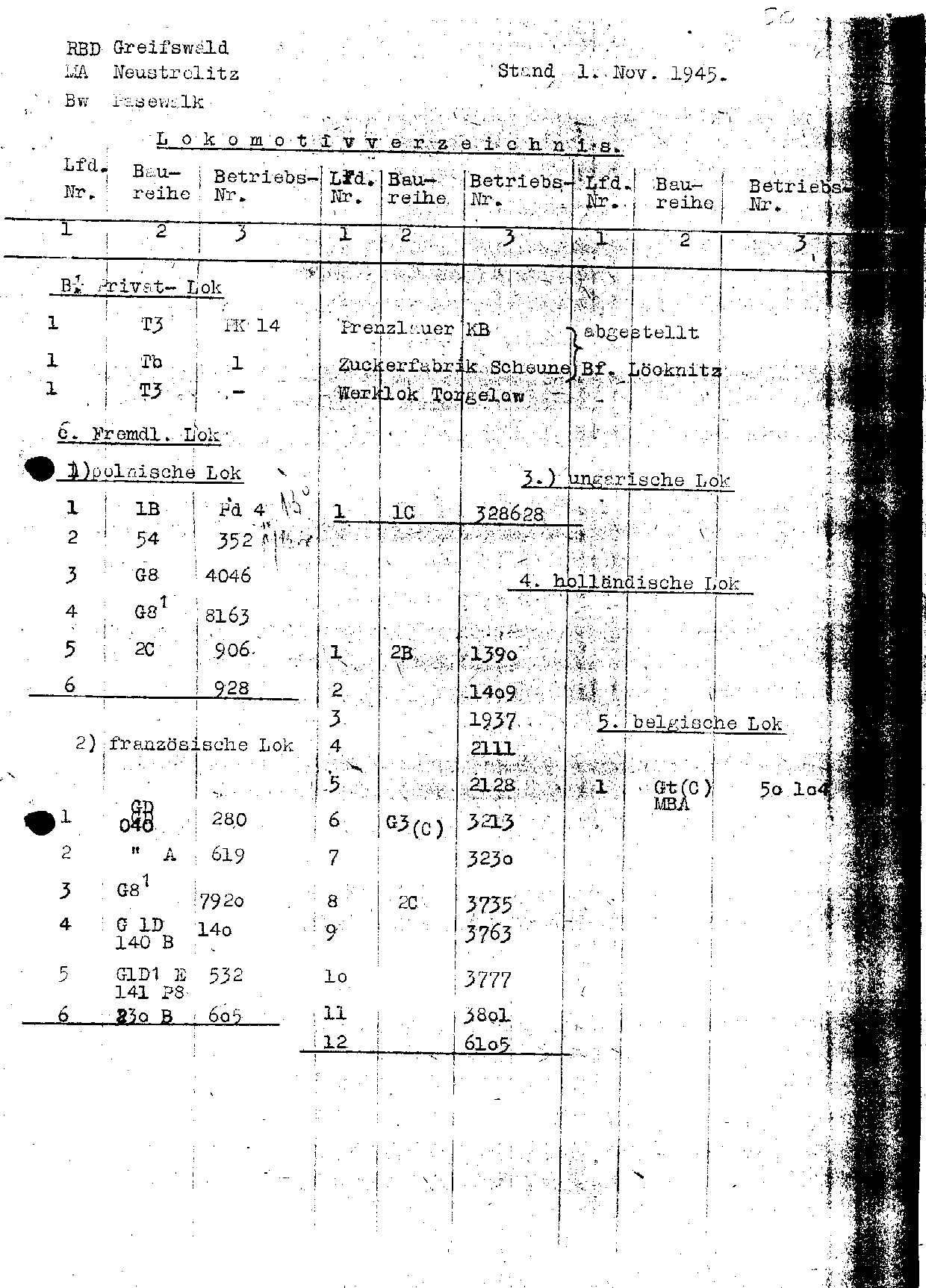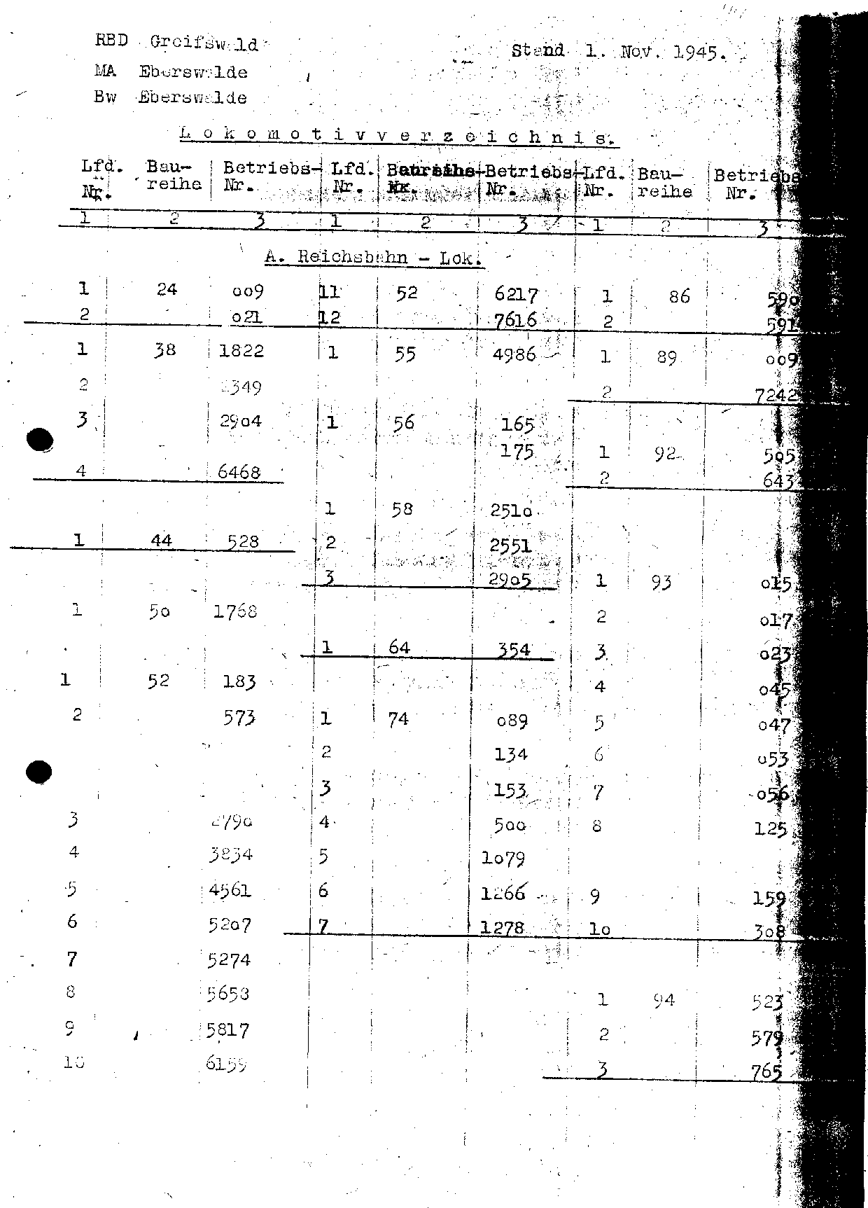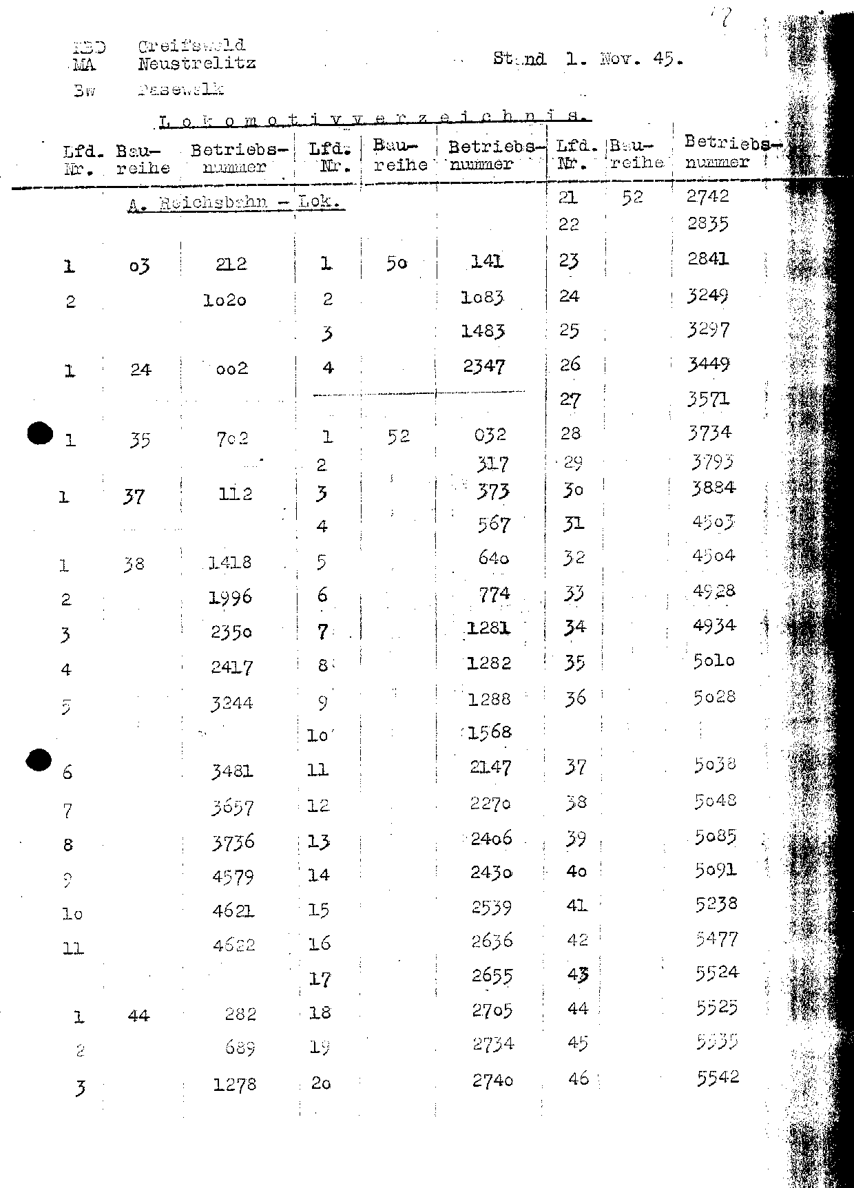 For the publication on the DR stock 1945/46 the source was an official stock list was. Below you find as an example the stock of the Rbd Greifswald. Each page was scanned with 150 dpi - the size of the single Gif-Files is typically 40-60 kBytes. As an alternative there also exists the possibility to download all 14 pages as a Zip file in one step (670 kByte).