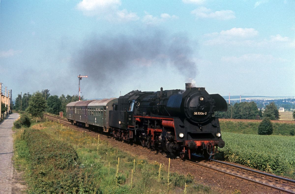 Bild 5: DR 58 3006 kurz hinter Glauchau-Schönbörnchen (Oberschindmaas). Zug fährt Richtung Meerane, rechts ist die Strecke Dresden - Werdau nach Mosel zu sehen.