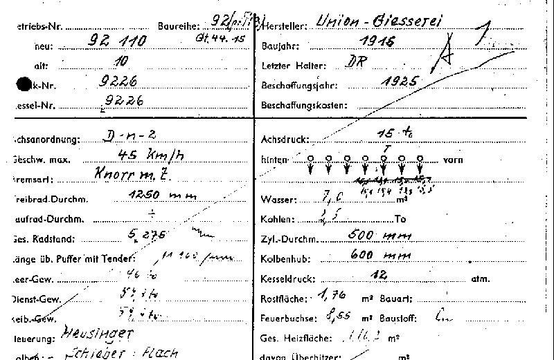 The OHE railway created card files for all of their locomotives. The card of 92 110 is shown below.