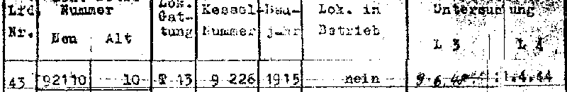 The problem is, that these data can't be right, as the ever highest Union works number has been 2842. So it was assumed, that 9226 was a writing error and that 2226 has been the real works number, as this number actually belonged to a T13 built in 1915. That locomotive was delivered as "BRO 7909 T13", came in 1918 or 1920 to Poland (PKP TKp1-26) and 1941 to the "Deutsche Reichsbahn" with the number 92 973. The railway Celle-Wittingen shall have bought this locomotive in 1943. But there are some hints, that the above described assumption is wrong. The PKP renumbering plan of 1946 mentions, that the DRB 92 973 became the new PKP TKp1-46. And the PKP boiler list gives as boiler of TKp1-46 "Union 15/ 2226". So it is quite certain, that 92 973 actually came into the PKP stock after WWII.