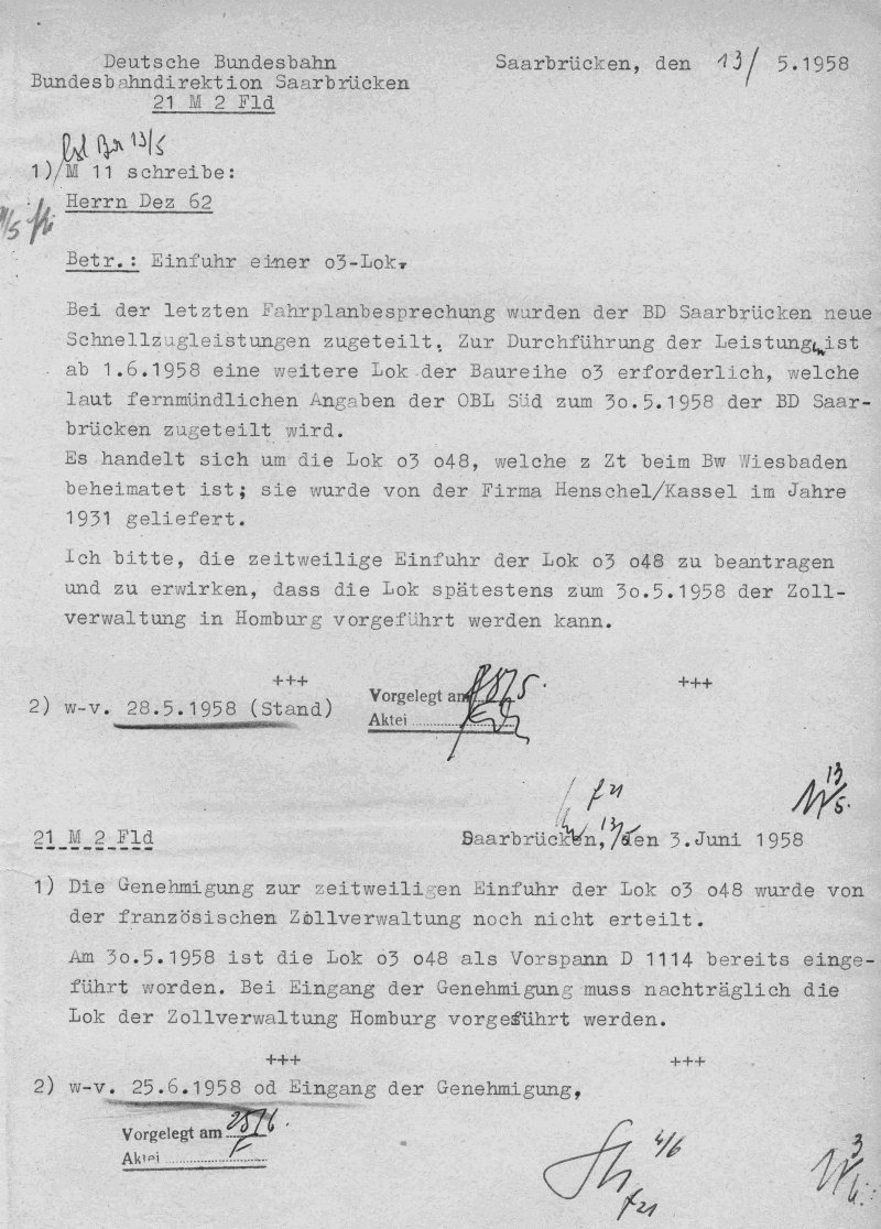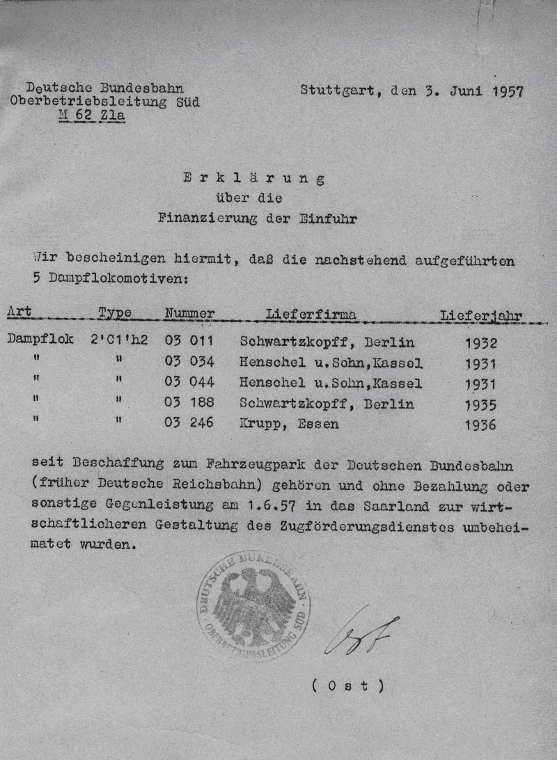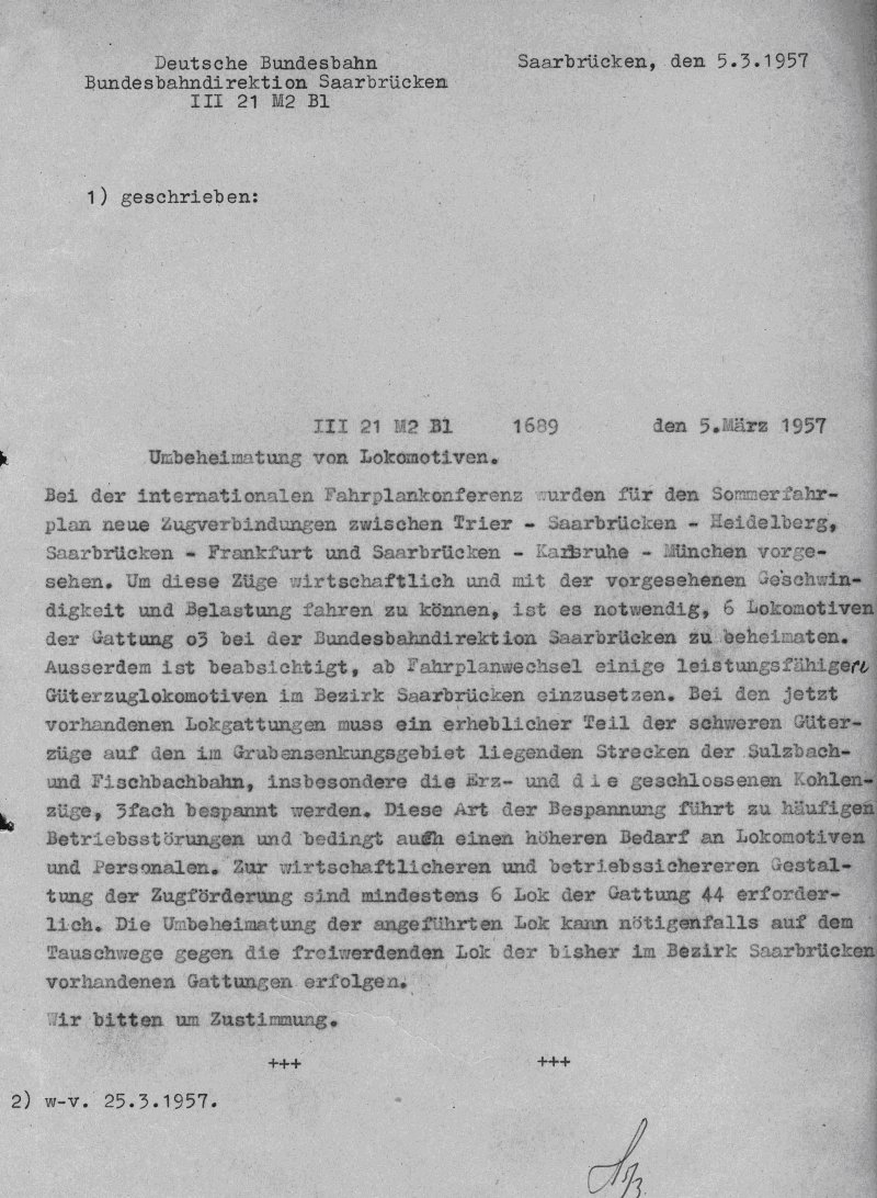 Zum 1.6.1957 wurden die genannten Loks an Bw Kaiserslautern übergeben, die notwendigen Unterlagen für