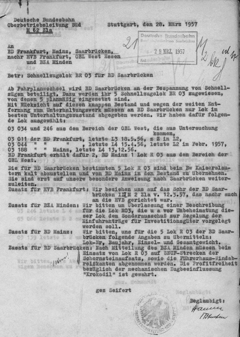 Inzwischen hatte die OBL Süd festgelegt, welche 03er woher an Saarbrücken abzugeben waren, von 44ern