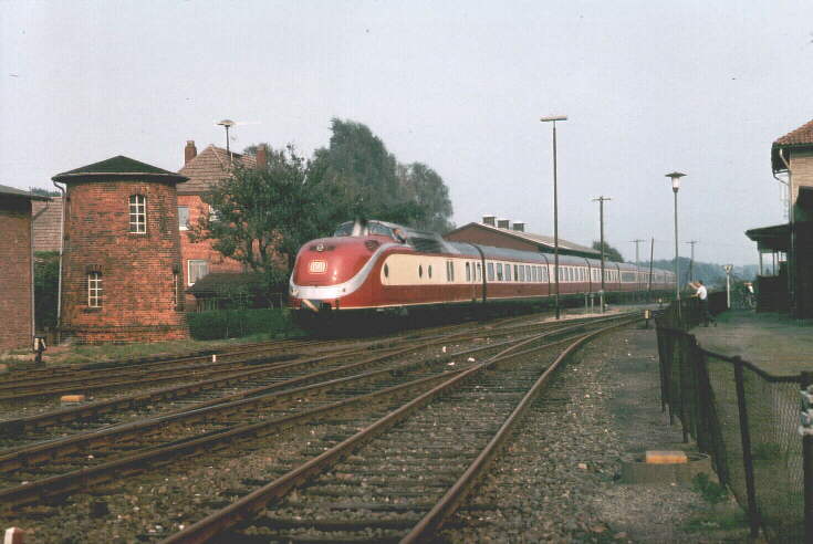 Hoher Besuch bei der OHE! Während des MOROP-Kongresses in Hannover besuchte am 18. September 1982 ein DB-Triebwagen der Baureihe 601 den OHE-Bahnhof Beckedorf.