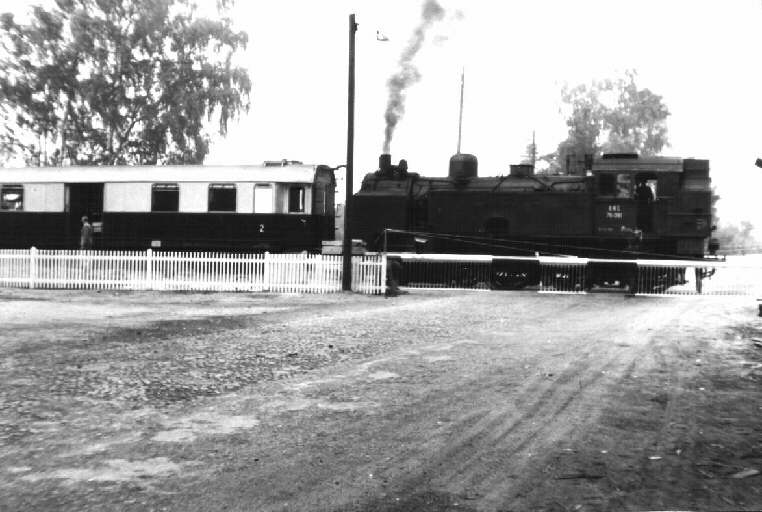 76 091 am 1.8.1950 in Groß Oesingen. Die vierachsigen Personenwagen waren damals noch zweifarbig gestrichen.