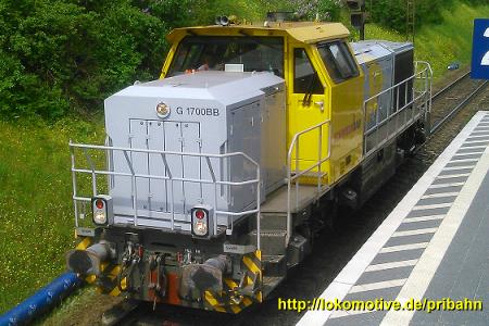 Ende eines Gleisbauzugs im Einsatz. Hier sieht man die etwas kürzere Type G1700BB von MaK. Die hat